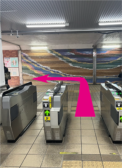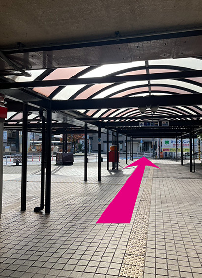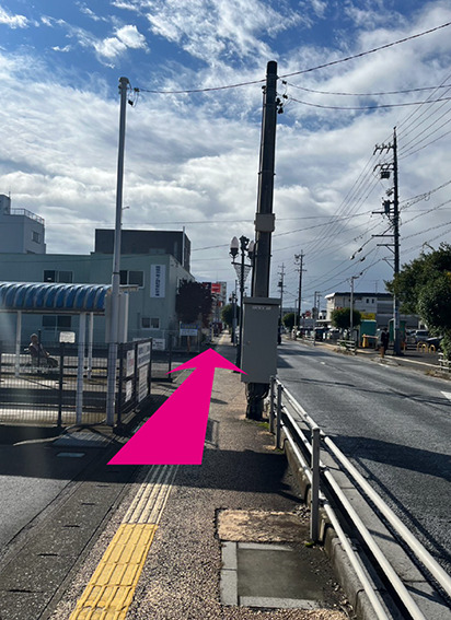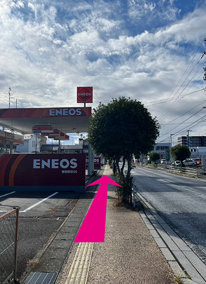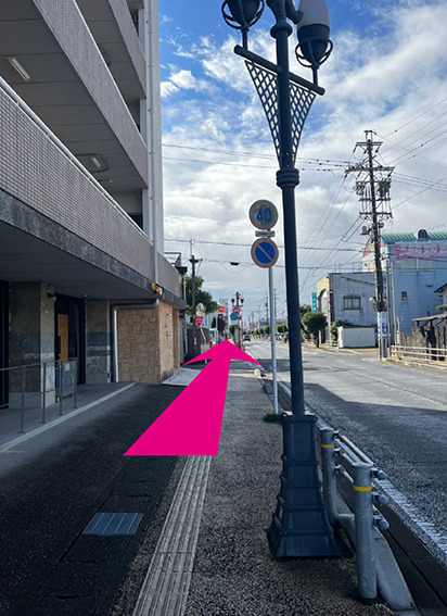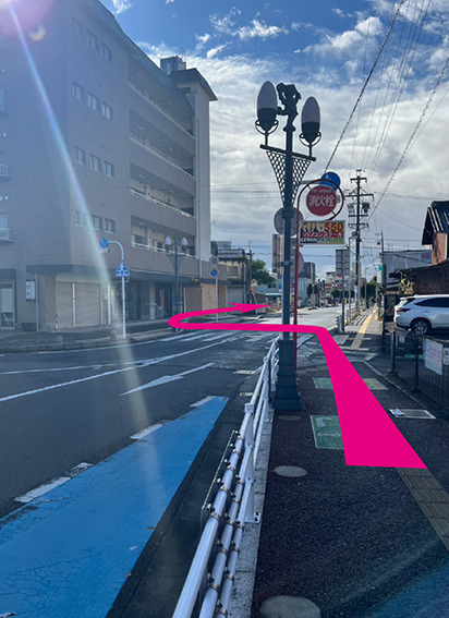 左手に茶色のマンションが見えたら横断歩道を渡り直進します。